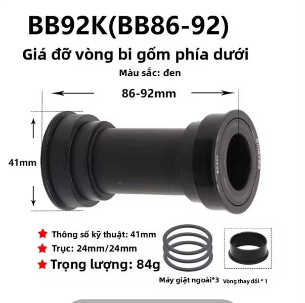 Trục giữa rỗng Cốt ép Gineyea BB92/K chính hãng (Aluminum cup+Bearing Ø41mm OD Alloy Cups Ø24mm*Ø24mm through Axle One size fits 86-92mm)